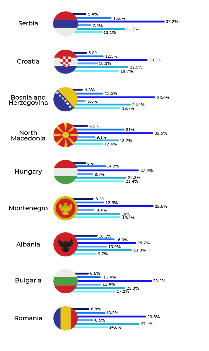 With respect to the trend of the number of gig workers, all the countries with the exception of Bosnia and Herzegovina, recorded a growth – from the “modest“ 12.2% in Serbia and 14.9% in Montenegro, to the notable growth rates exceeding 20% in as many as four countries: Hungary 27.5%, Albania 25.6%, Romania 21.9%, Croatia 20.9% and North Macedonia 20.7%. Although Bosnia and Herzegovina recorded a 6.5% drop of the number of gig workers, an incredible growth of almost 40% registered in the previous measurement, allows it to have a significantly more numerous gig population on this platform today more than a year ago.
