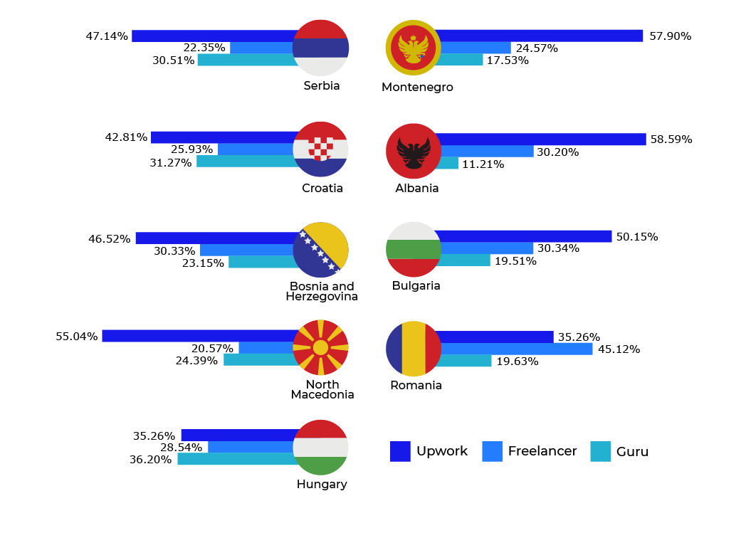 In the distribution of gig work, the dominant regional position is still held by Upwork with a market share of 45%. Freelancer and Guru follow with 30.6% and 24.4%. Although the latest measurement did not bring significant changes when it comes to the market shares of the three observed platforms, there were still some shifts. Upwork continues to dominate and it is the most popular platform (in 7 out of 9 countries), which is a significant change compared to the previous measurement where it was the most represented platform in all countries. Read more ...