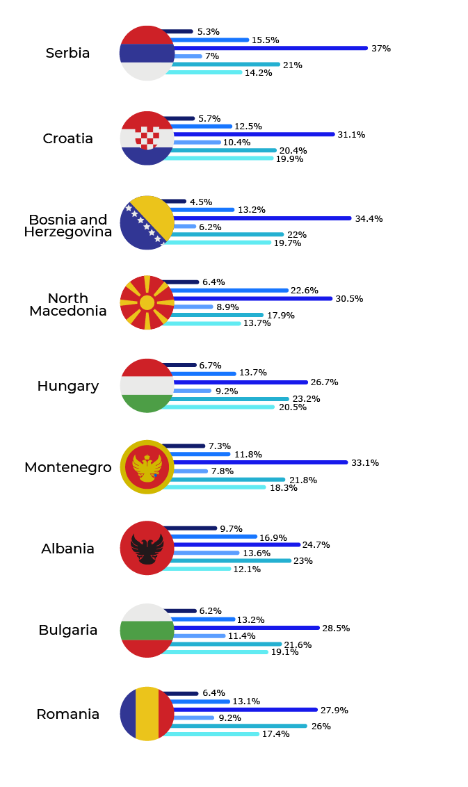 All countries recorded an increase in the number of gig workers. However, significant growth was achieved only in Hungary (31.8%), while in other countries the growth was in double digits (Albania – 21.9%; Montenegro – 16.1%; Serbia – 12.5%; Croatia – 11, 7%; North Macedonia – 10.7%; Bulgaria – 10%), i.e. single digits (Bosnia and Herzegovina – 9.3%; Romania – 6%).