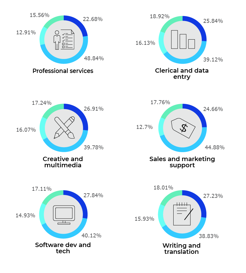 Writing and translation has seen the greatest increase (over 24 percent), with the smallest yet still significant growth (at 7.5 percent) registered in sales and marketing support