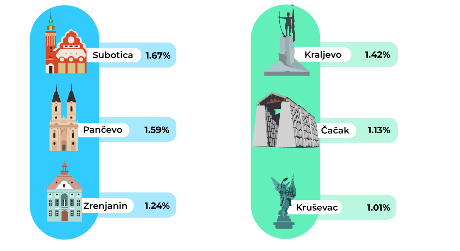 The latest survey found the freelancer population exceeding 1 percent in 11 towns and cities. Apart from large administrative centres, these were Subotica, Pančevo, Kraljevo, Zrenjanin, Čačak, and Kruševac, with Jagodina joining the list for the first time.