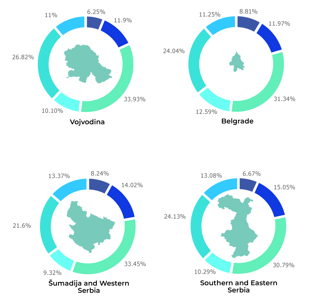 Continuing measurement of the gig population by region reveals the largest part of this population (86.2 percent) lives and works in 28 Serbian cities and towns. The findings of this survey also provide evidence for the increasing urbanisation of freelancers, which echoes the results of recent studies that show ever greater agglomeration of online gig workers.