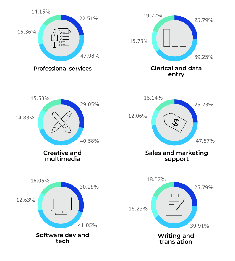 Expansion vs contraction Apart from creative and multimedia (with a decline of -2.3 percent), a moderate contraction was also registered in writing and translation (-2.1 percent), software dev and tech (-1.5 percent), and professional services (0.3 percent). Conversely, in addition to the huge growth in clerical and data entry (at 31 percent), sales and marketing support also saw a significant increase (at 14.6 percent). These figures provide some context in which to interpret the upward trend in average freelancer incomes, as this increase was driven by substantial growth in the first two occupations that offset the decline in the other sectors.