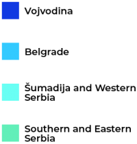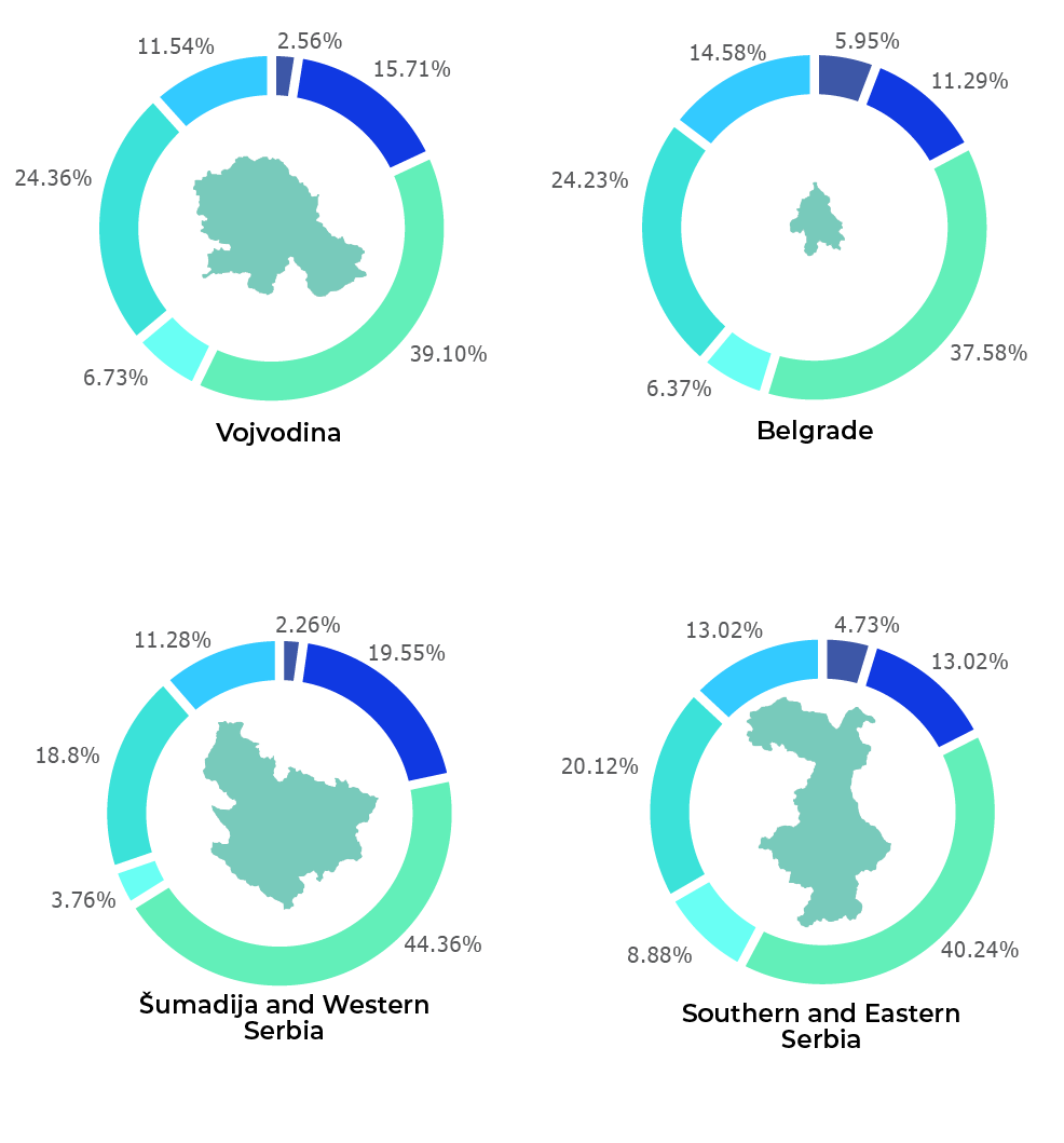 The figures reveal the distribution of gig workers by occupation in each region. Interestingly, the largest proportion of freelancers in each region work in creative and multimedia services, whilst the smallest share provide professional services. The remaining occupations are represented to varying degrees in each region, with no major differences in evidence other than the negligibly small number of freelancers in the professional services sector in Šumadija and Western Serbia.