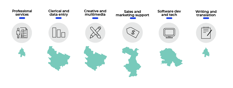 Belgrade enjoys relative comparative advantages in professional services, software development and technology, and writing and translation. Professional services clearly lead the field (more than 62% of all gig workers in this occupation are from Belgrade), but also employ the lowest proportion of freelancers, at no more than 4.36 percent of the total workforce. Vojvodina’s comparative advantages lie in clerical and data entry, sales and marketing support, and software development. This region is best placed for clerical and data entry, being home to nearly 1 in 3 of all Serbian gig workers in this occupation and lagging behind Belgrade by less than 4 percent. The small scale of this difference is especially obvious if contrasted with the fact that professional services freelancers based in Belgrade outnumber those from Vojvodina by a factor of nearly 4, or with the fact that the capital is home to almost twice as many gig writers and translators. The figures for the remaining two occupations are only slightly above the average, so Vojvodina does not enjoy a major comparative advantage in these areas. Most gig workers in Southern and Eastern Serbia are active in professional services, the creative and multimedia industry, and sales and marketing support. This region enjoys the greatest edge in sales and marketing, with one in five of all Serbian freelancers in this field based here. Professional services are another strong point for this part of Serbia, as its share of platform workers in this occupation is the same as Vojvodina’s, even though the total gig workforce in Vojvodina is nearly twice as large. Western Serbia and Šumadija has the smallest gig worker population that is focused on clerical and data entry and multimedia and creative services. The clerical sector is the strong suit of this region, which is also the only region with a smaller total workforce that has a greater share of freelancers in a particular occupation compared to more populous areas. Even though the freelancer population of Southern and Eastern Serbia is larger than that of Western Serbia and Šumadija by more than 3 percent, its share of clerical gig workers is also smaller by close to 3 percent.