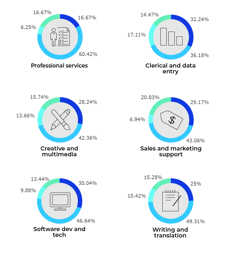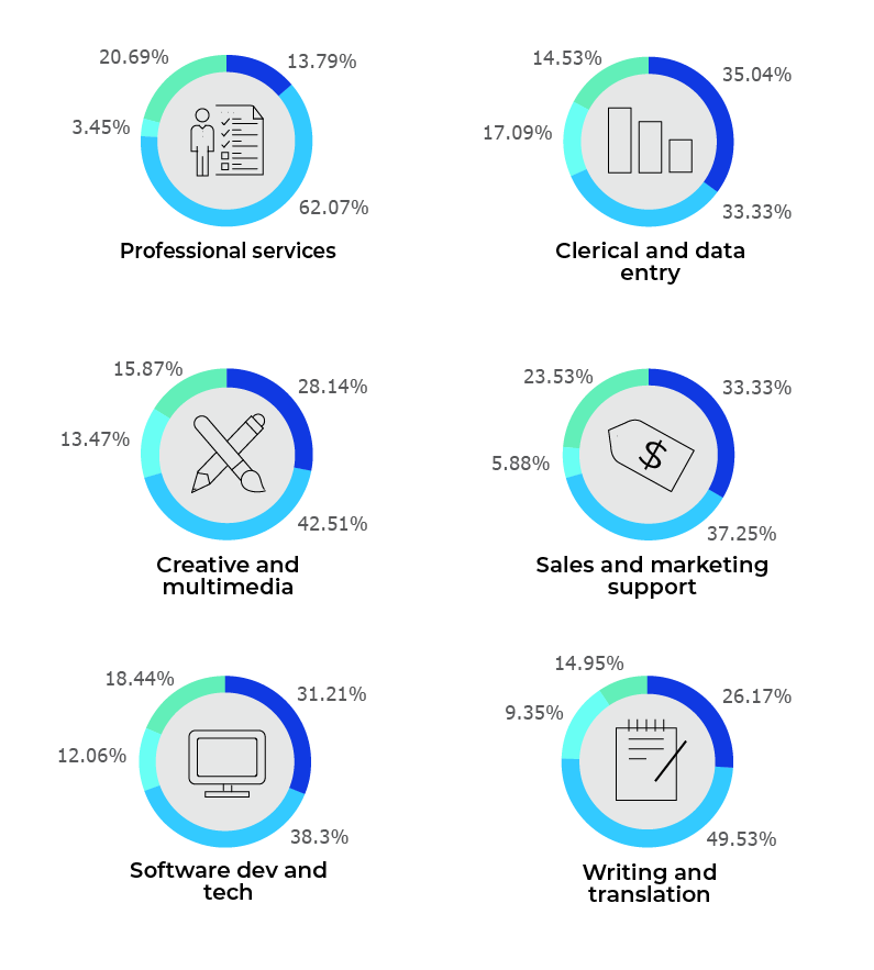 Looking at those who had work in October, the key conclusion is that this group were more likely to be active in less well-paid occupations such as data entry and sales and marketing support. A total of 44.76 percent of the entire gig workforce were engaged on specific projects in October. The lowest rate of requests for projects was identified in software development and technology, where one in three freelancers (33 percent) were engaged, with sales and marketing support and clerical and data entry seeing the most work (50 percent). Multimedia and creative freelancers had slightly fewer projects, at 48.7 percent, followed by gig workers in the writing and translation sector, at 45 percent, and those in professional services, at 42 percent. The relative shares of individual occupations in the workforce have remained fairly stable. Professional services account for 4.3 percent of the total, data entry and clerical for 13.97 percent, creative and multimedia services dominate with 39.25 percent, sales and marketing support account for 6.43 percent, software development and technology for 22.97 percent, and writing and translation for 13.05 percent.
