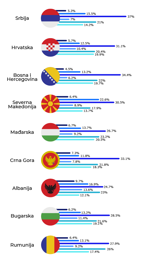 Sve ostale zemlje beleže komparativne prednosti u dve oblasti. Ove zemlje, ujedno imaju i najsličniju profesionalnu strukturu tržišta gig rada. U slučaju Bosne i Hercegovine, komparativne prednosti se pojavljuju u oblastima kreativnih usluga i multimedije, i pisanja i prevođenja, dok se komparativna prednost u oblasti razvoja softvera izgubila. Bugarska ostvaruje prednosti u oblastima prodaje i marketinga i pisanja i prevođenja, ali je u proteklih 6 meseci izgubila prednost u oblastima profesionalnih usluga i kreativnih usluga i multimedije. Severna Makedonija je ostvarila novu komparativnu prednost u oblasti profesionalnih usluga, dok je zadržala prednost u oblasti unosa podataka i administrativnim uslugama. Na kraju, Srbija, beleži blagu komparativnu prednost u oblasti unosa podatka i administrativnim uslugama, osim izražene prednosti u oblasti kreativnih usluga i multimedije.