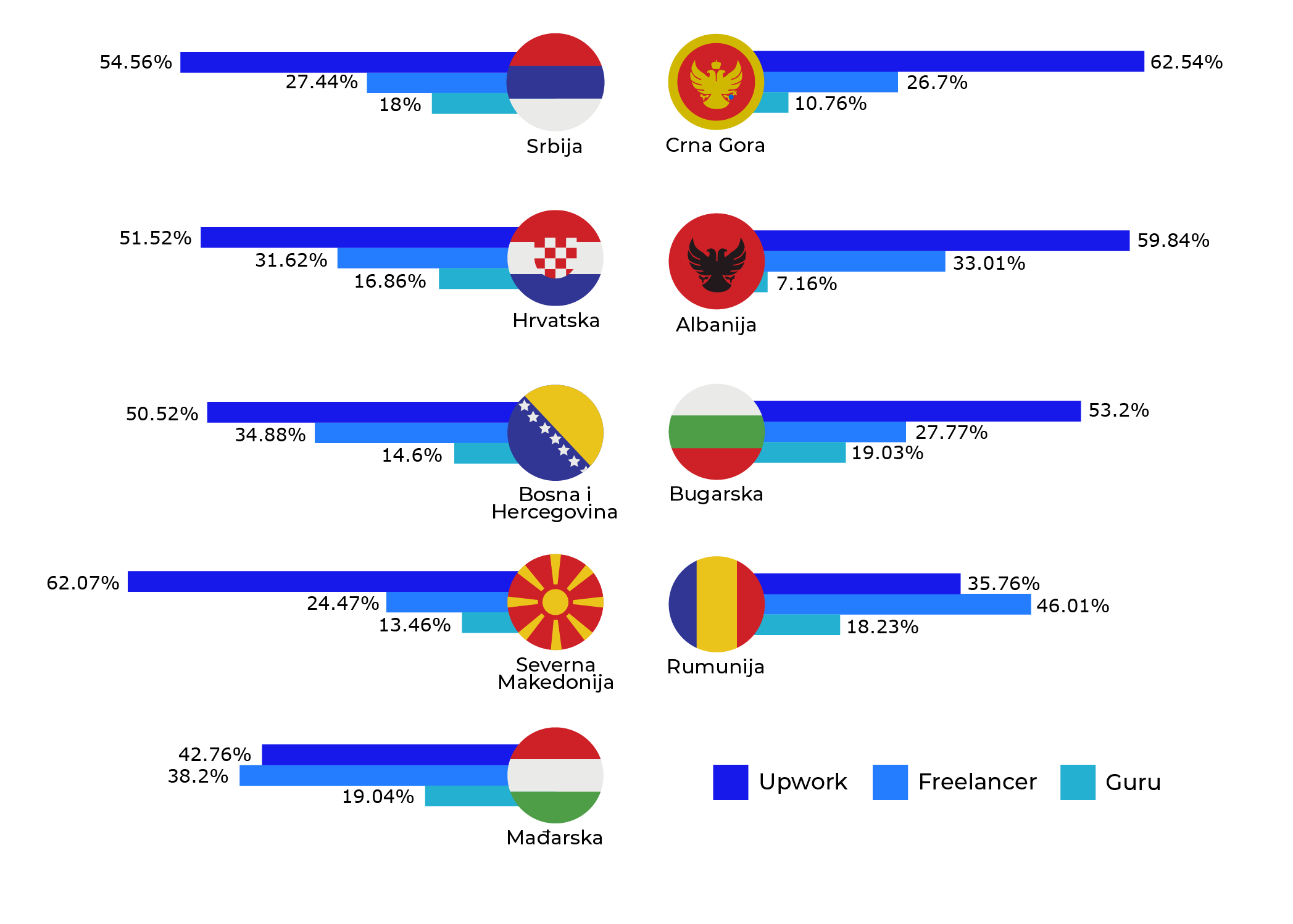 Jedine dve zemlje koje su u najnovijem merenju ostvarile rast na svim platformama su Rumunija i Bugarska, pri čemu je rast bio daleko izraženiji u Bugarskoj. U ostalim zemljama, rast je ostvaren na Upworku i Freelencer-u, dok se populacija gig radnika smanjila na Guru-u. Rast je bio izrazito snažan, ali delimično različitog intenziteta u pojedinim zemljama, što je uticalo na promenu tržišnih udela koje pojedine platforme imaju u regionu jugoistočne Evrope.