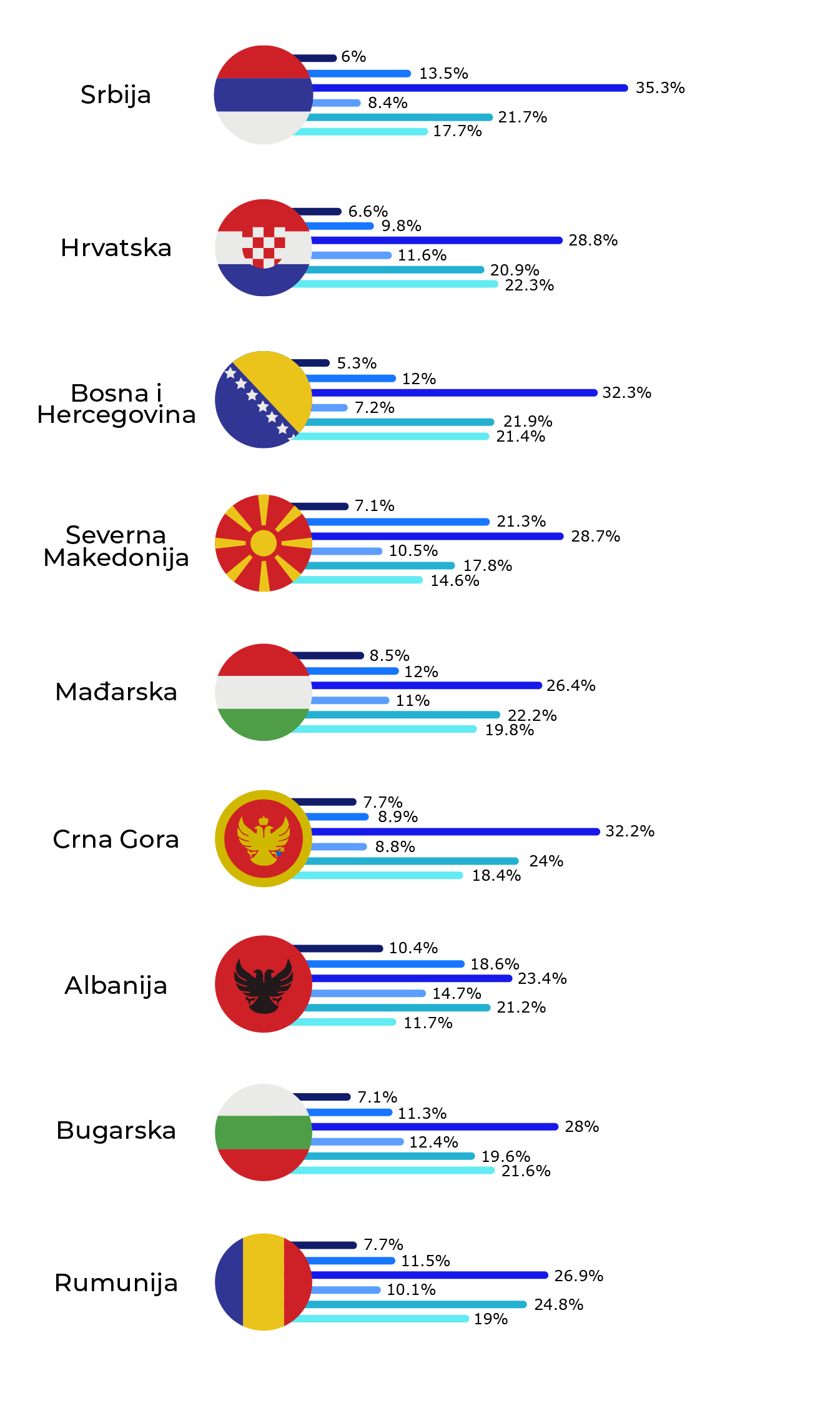 Zemlja sa najbrojnijom radnom snagom je Srbija – na koju otpada 23,6% ukupnog broja radnika. Srbija, ilustracije radi, ima za 20% brojniju radnu snagu, nego što je to slučaj sa drugoplasiranom Rumunijom.Detaljnije ...